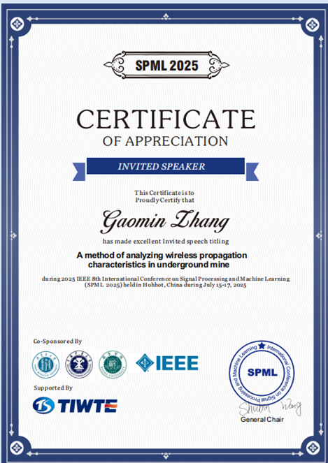 我院教师张高敏博士受大会组委会特邀,在“智能感知与通信技术”分论坛作题为《A method of analyzing wireless propagation characteristics in underground mine》的学术报告。该研究针对煤矿井下复杂电磁环境,分享了一种适用于煤矿井下的电磁波传播特性分析方法,为矿山智能化建设提供了技术支撑,受到与会专家的高度关注。