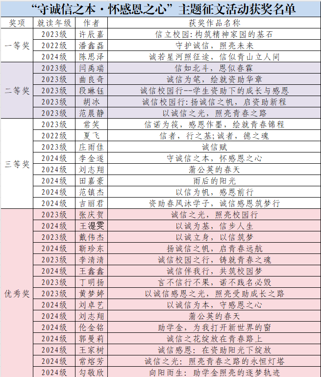 经专业评审组的认真评选,最终评选出一等奖3名、二等奖5名、三等奖8名、优秀奖15名。此次征文活动,不仅激发了同学们的文学创作热情,更以文化浸润的方式,让诚信之花在校园绽放,为建设诚信校园、培育时代新人注入强劲动力。